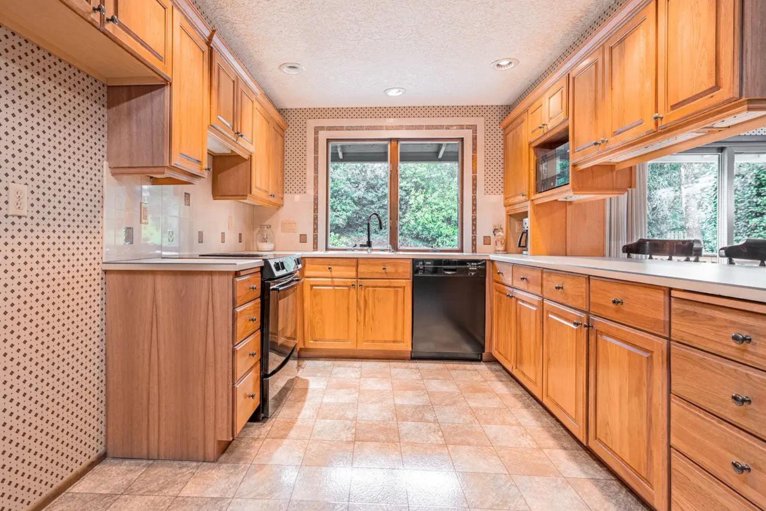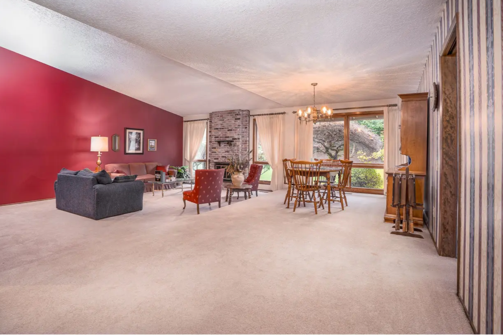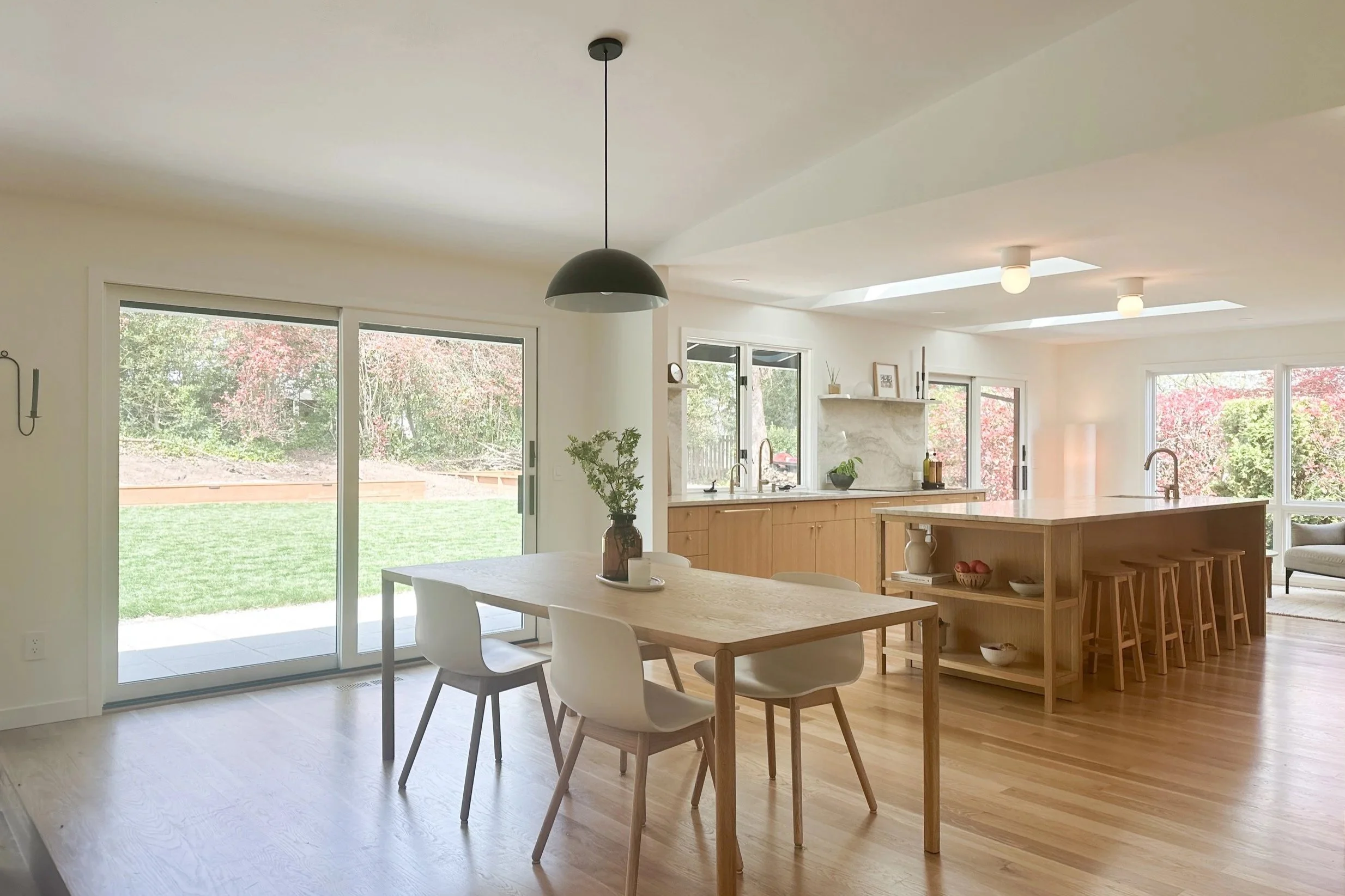 Open, connected, and inviting, this living space extends effortlessly into the backyard through a new sliding door. Vaulted ceilings and custom white oak built-ins enhance light, warmth, and craftsmanship throughout.