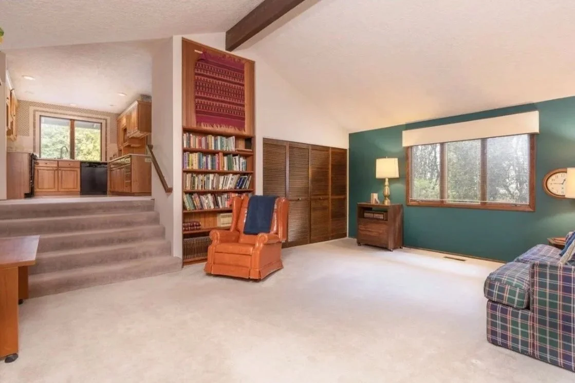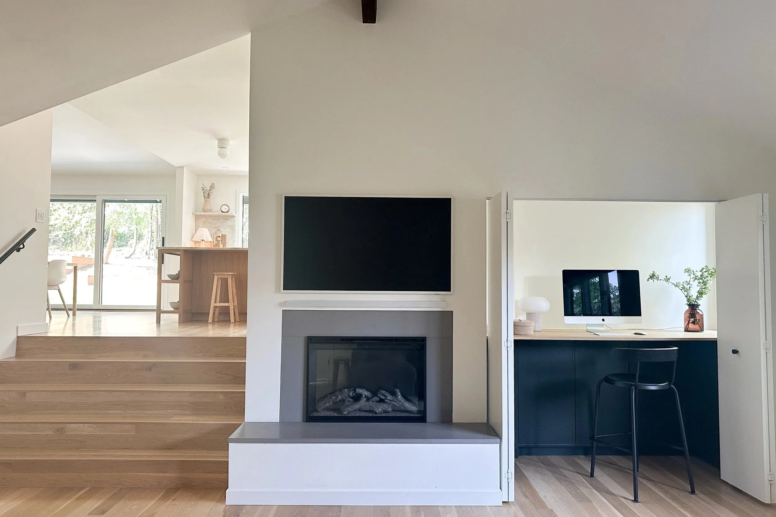 The lower-level living space was transformed into a functional retreat. A new energy-efficient electric fireplace anchors the room and adds year-round comfort, while a custom office nook — complete with a newly installed window and white oak desk — brings light and purpose to the space.