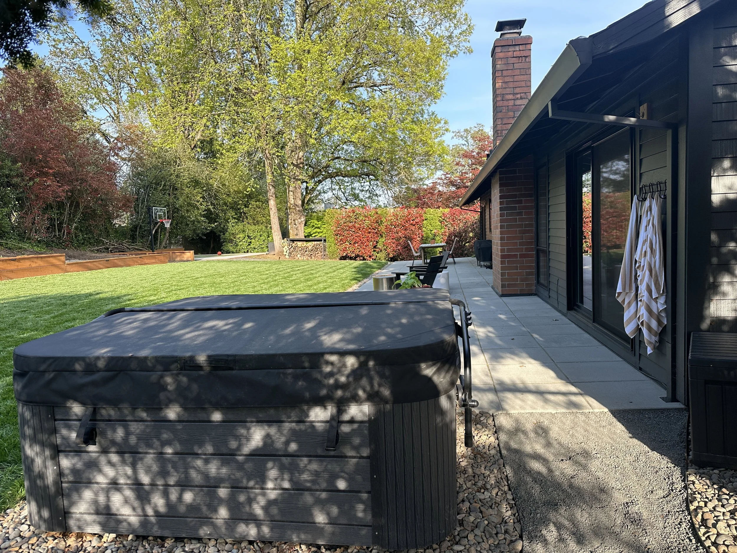 The backyard was redesigned for year-round enjoyment and connection, featuring a durable paver patio that extends the length of the home for seamless indoor-outdoor living. A leveled yard, new retaining wall, hot tub, and sport court create a versatile retreat for relaxation and play.