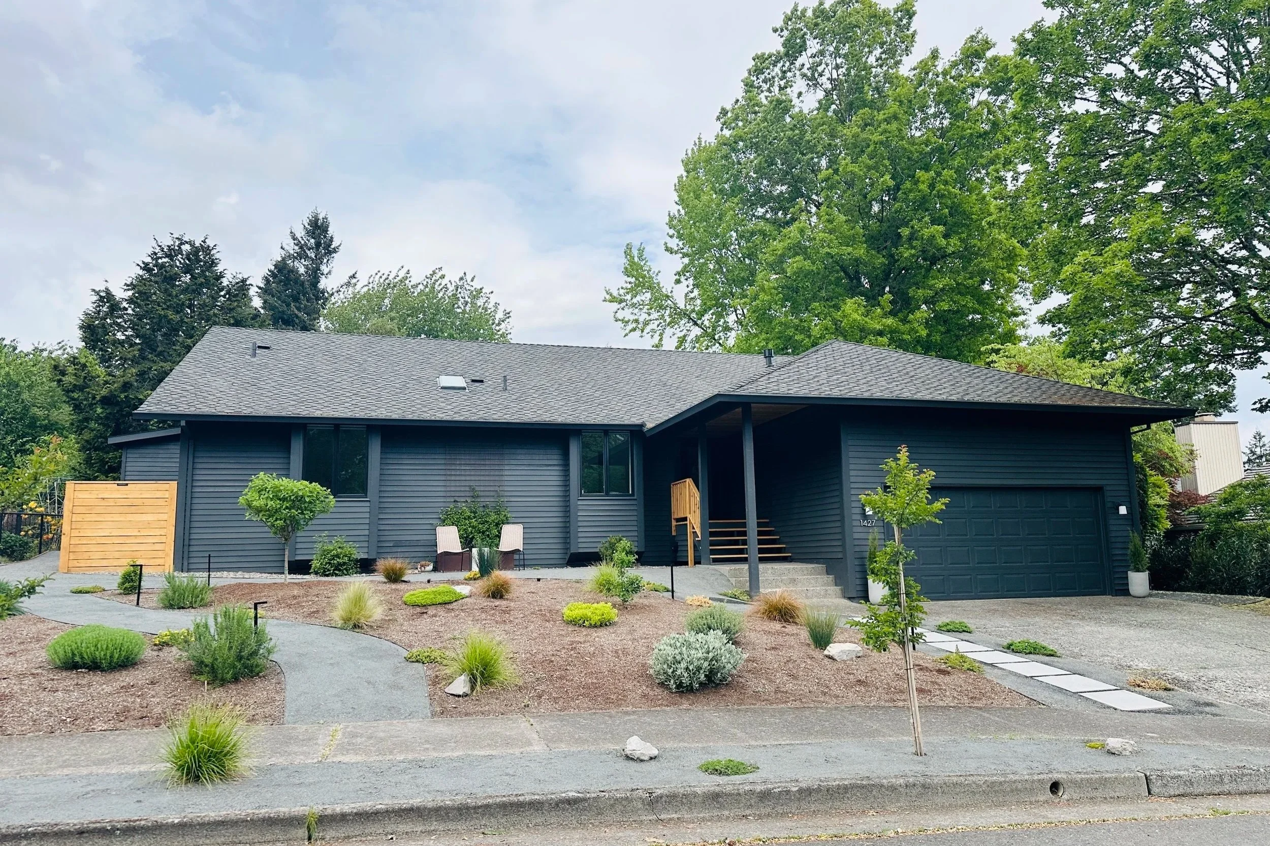 The front entry was transformed into a warm, welcoming space with lasting curb appeal and easy upkeep. Drought-tolerant landscaping, a new sprinkler system, and natural cedar accents create year-round beauty and a comfortable place to enjoy the outdoors.