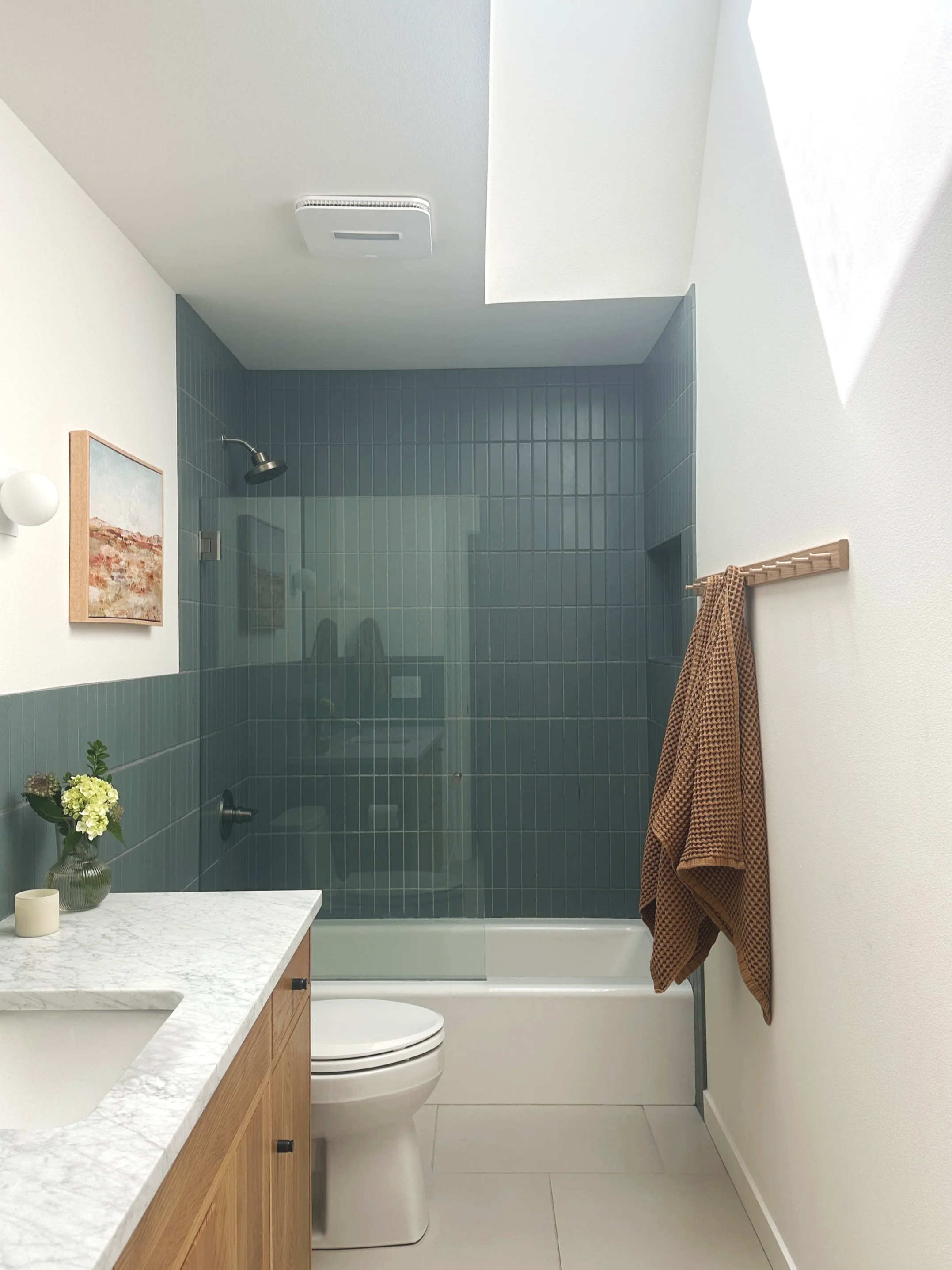 Accessibility and comfort were in mind for the bathroom redesign. Removing the step created a smooth, barrier-free transition, while a new skylight adds natural light and openness. A new bathtub and updated finishes complete the space, blending modern design with everyday ease.